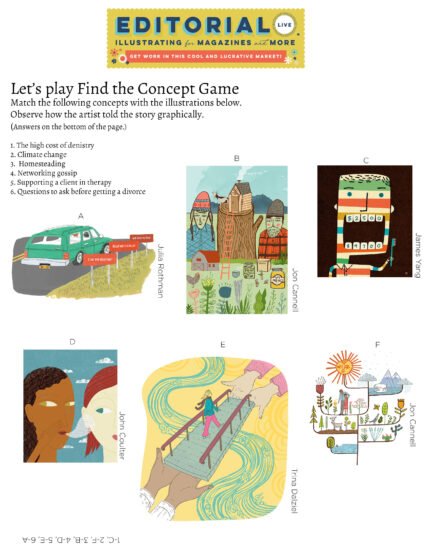 Art agent Lilla, who has also worked as a successful editorial illustrator and has decades of experience as an innovative educator, has come up with her fun Find the Concept Game to get you to start thinking about how you can come up with concepts for your work.