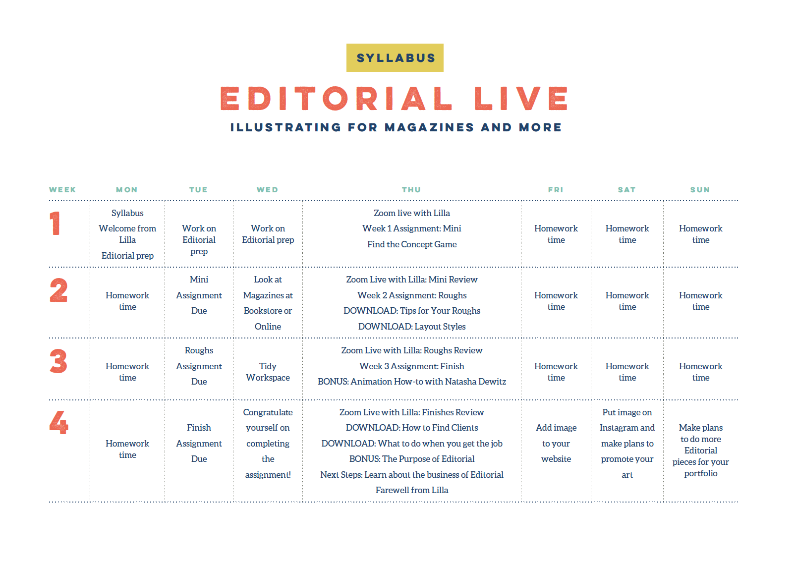 Here’s your syllabus for the four-week course. Look at all that goodness!