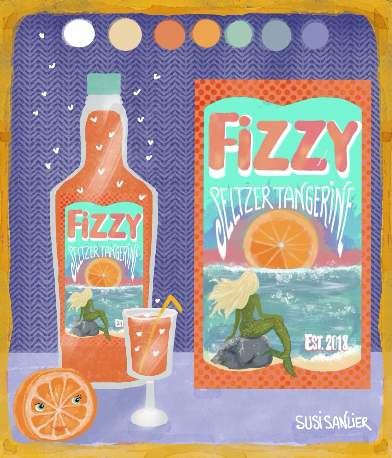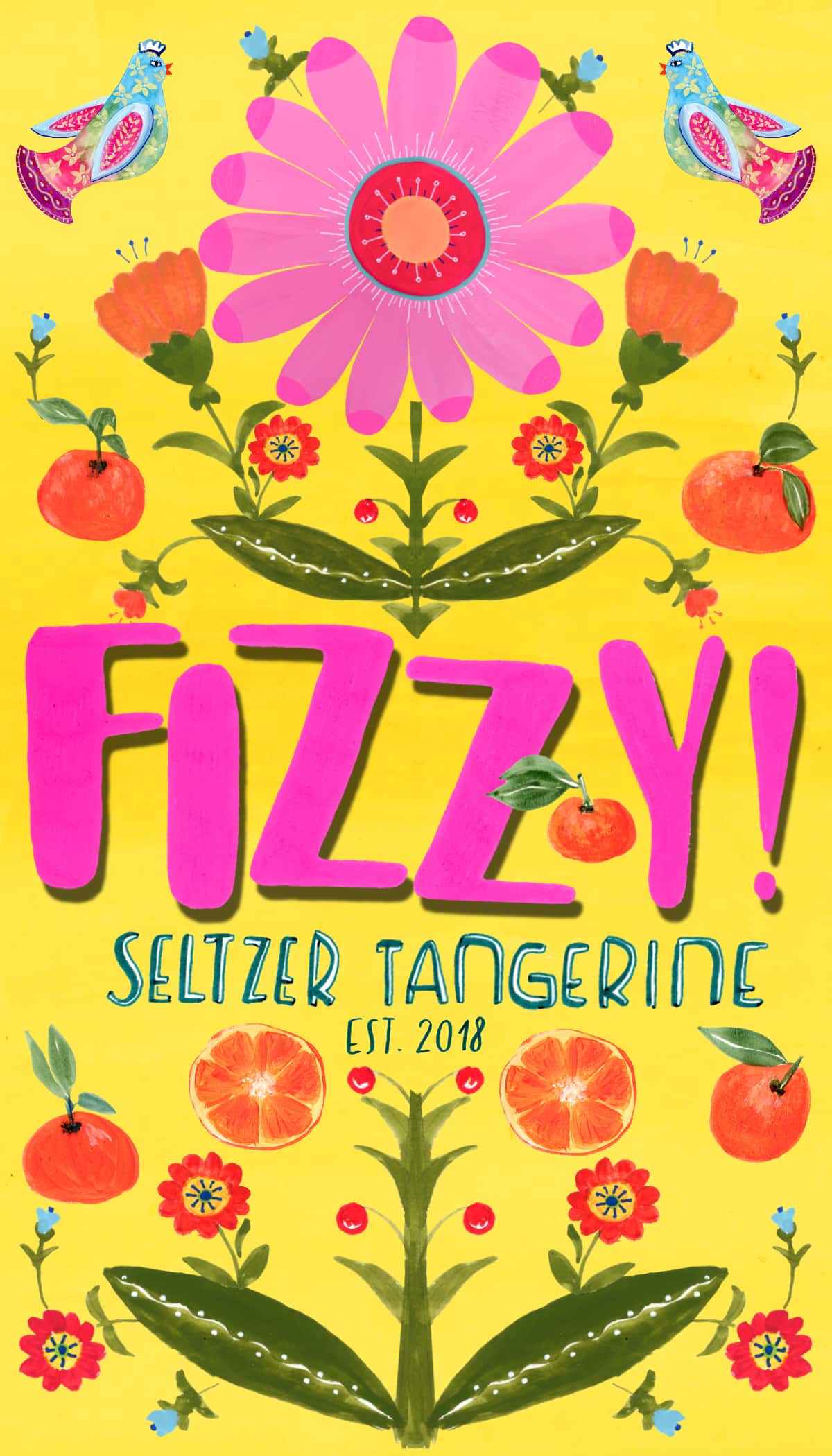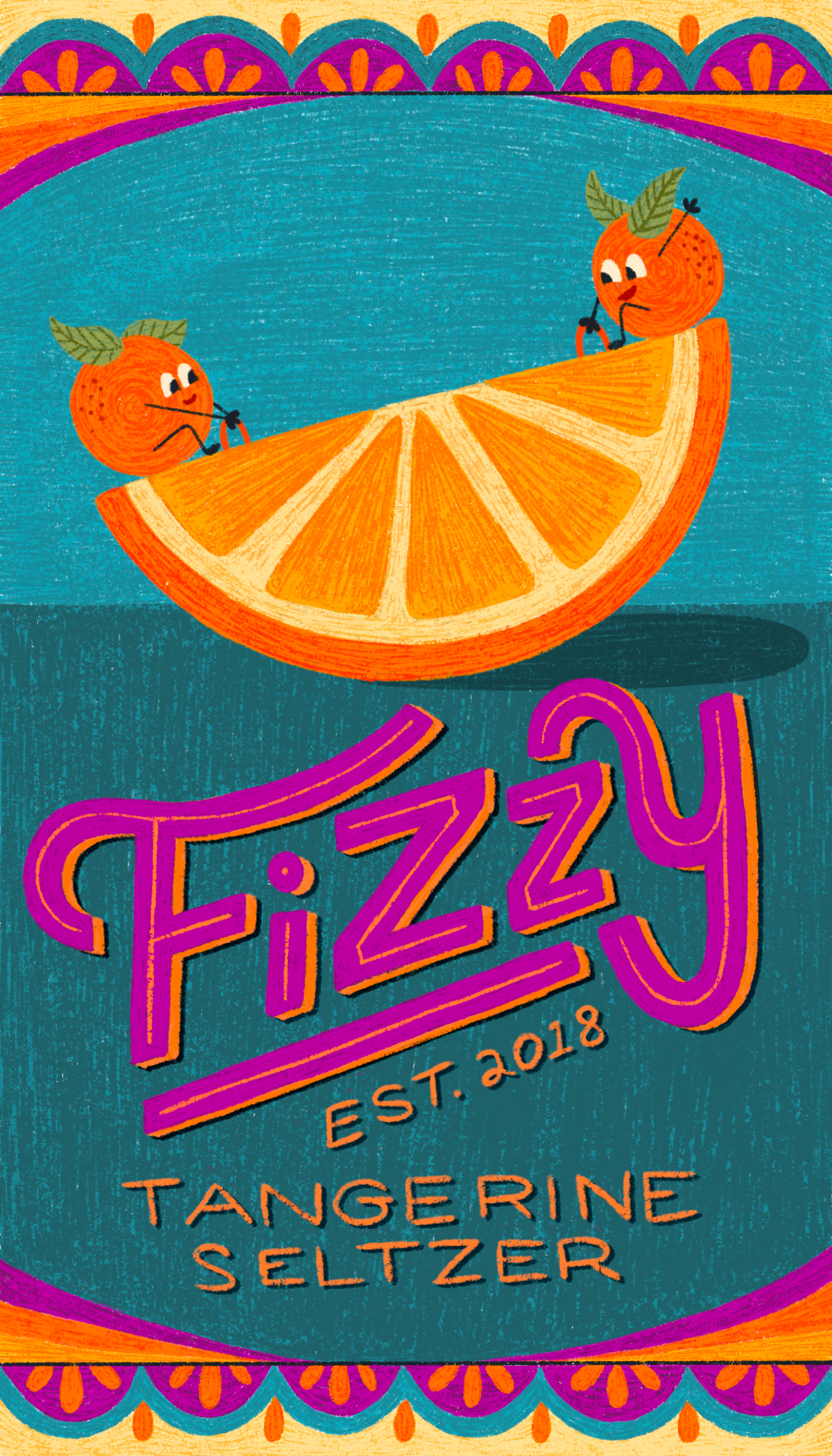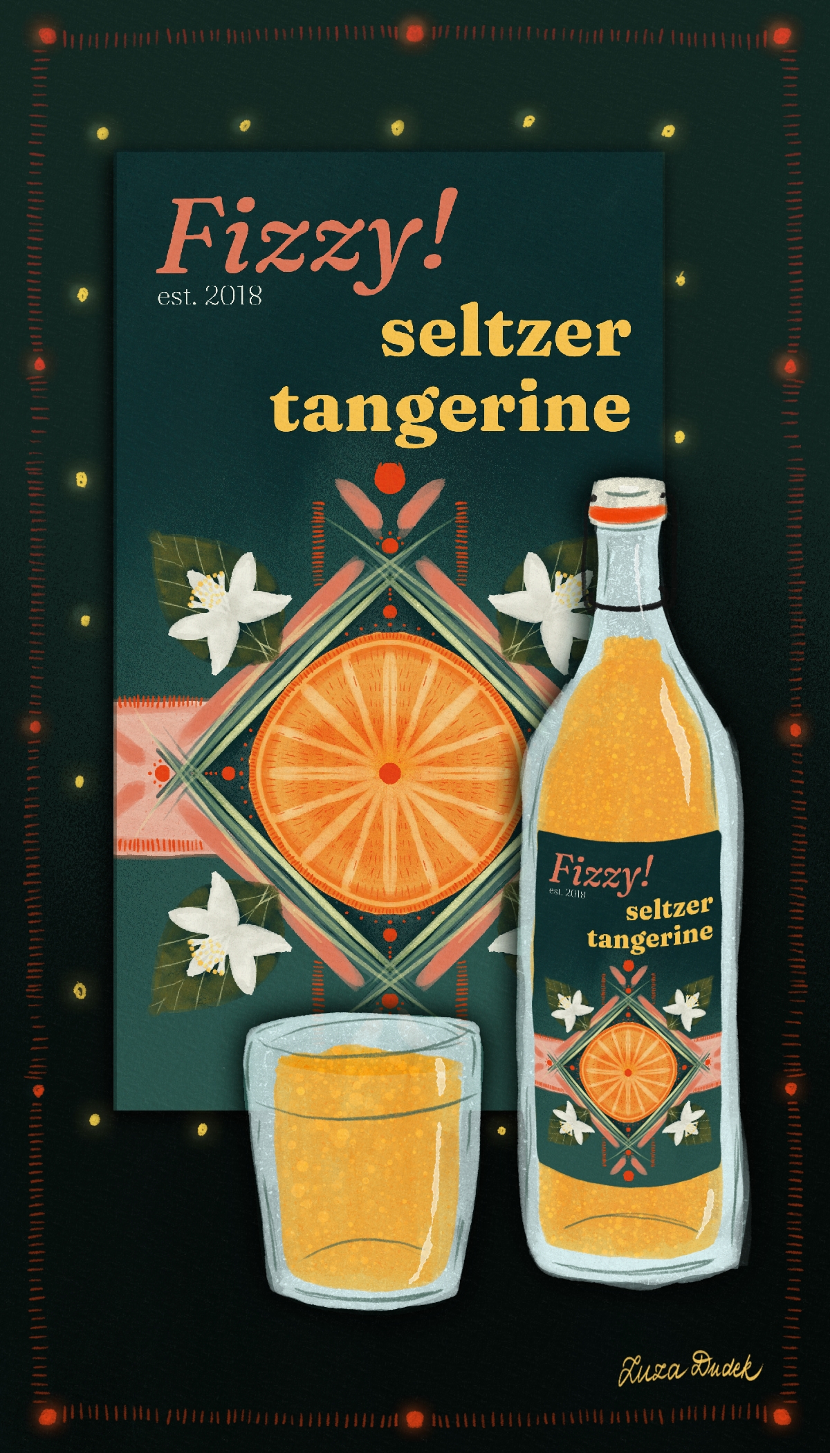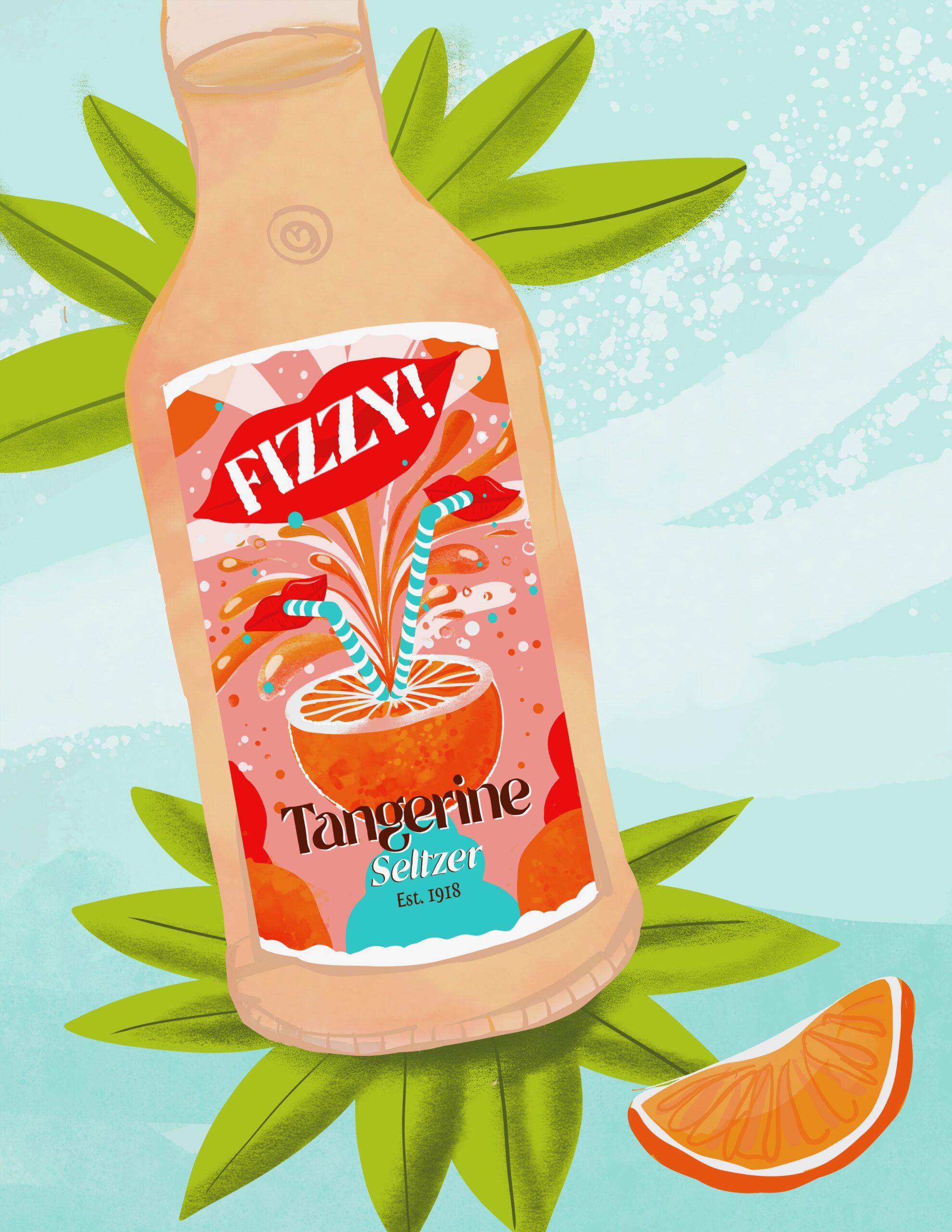 Title: Beverage label illustration - Fizzy! Seltzer Tangerine || Name: Zuza Dudek || Website/Social media
